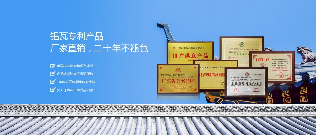 ■至今,正一金屬建材總占地面積近3.8萬平方米,擁有數十臺國際先進的全數控生產設備,年生產能力包括仿古鋁瓦和現代鋁瓦等可達數萬平米。先后摘取了“廣東省著名品牌”、“全國消費者放心滿意品牌”、“綠色環保品牌”、“用戶滿意產品”等多項榮譽稱號。